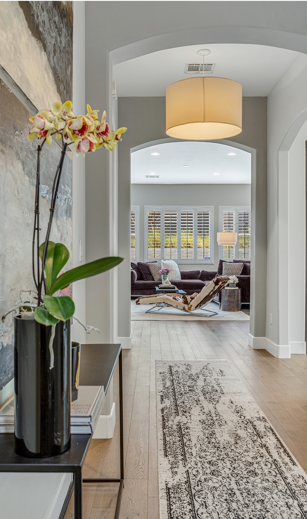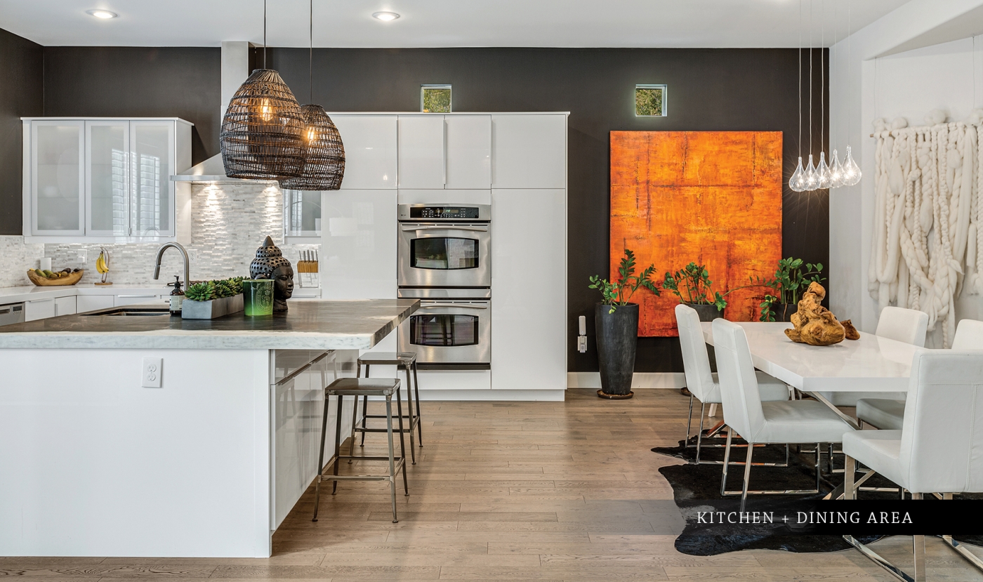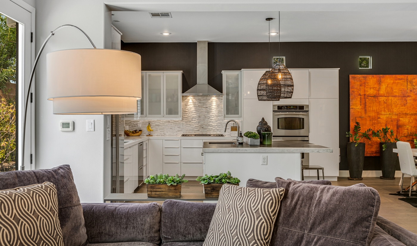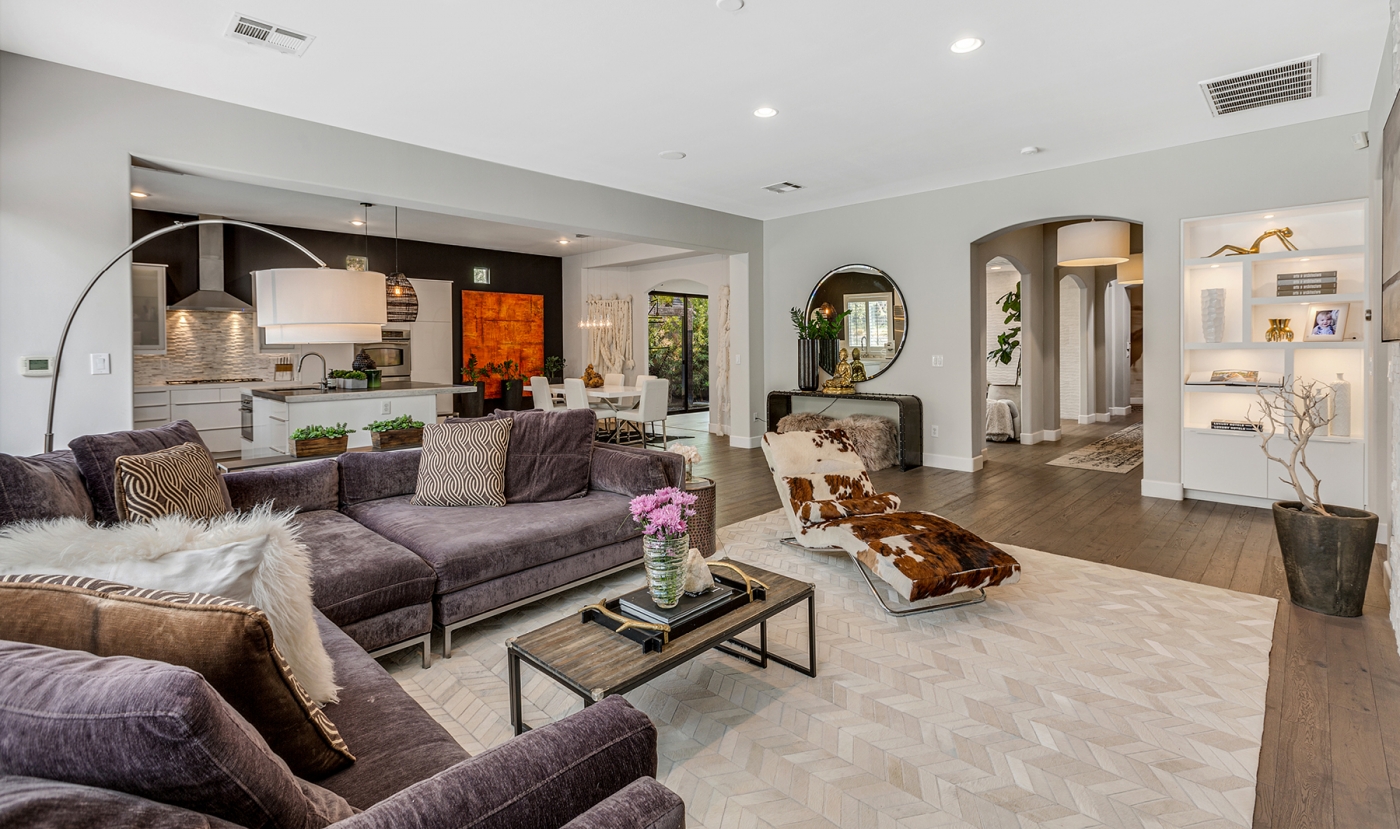 With an artistic presence that allows its spaces to live large, the edgy contemporary interior offers a wonderful showcase for eclectic furnishings and art. It features a mix of materials that are at once soothing and exciting, and a decor scheme that balances light against dark, smooth and glossy finishes with textural accents, and purely functional features with those that are decidedly whimsical in its 3,200 square feet. Step into the foyer and you can almost feel the rush of wind from a mural of galloping horses! Built originally in 2004 and recently updated, the dramatic interior flows effortlessly from a lushly-landscaped entry court to a backyard oasis that seems in every way like a portal to another dimension. A massive interior great room opens to a stunning inground pool and spa adjacent to a multi-level outdoor gathering space. A full surround of privacy wall shields various areas from view, including an imaginative four-poster lounging bed and an al fresco dining room. A fully-equipped outdoor grilling and serving area makes entertaining a breeze. There is also an outdoor shower, a private meditation court, and a playhouse for the young or young-at-heart!